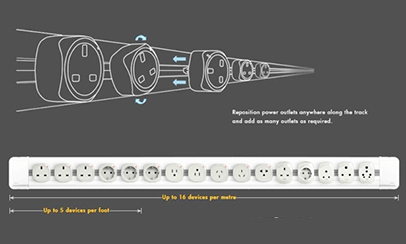 The revolutionary GSS Systemâ„¢ allows one to add, remove and reposition power outlets anywhere along a power track.
